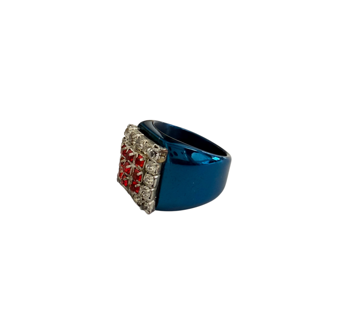 טבעת כמעט מלכותית אבל עם טוויסט קר ומודרני, כמו תכשיט של שושלת עתיקה שעבר ריסטארט לעידן עתידני. מתכת כחולה עמוקה ועליה כתר של אבנים אדומות בוערות, מוקפות בזוהר קריסטלי חד.