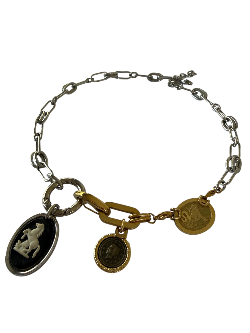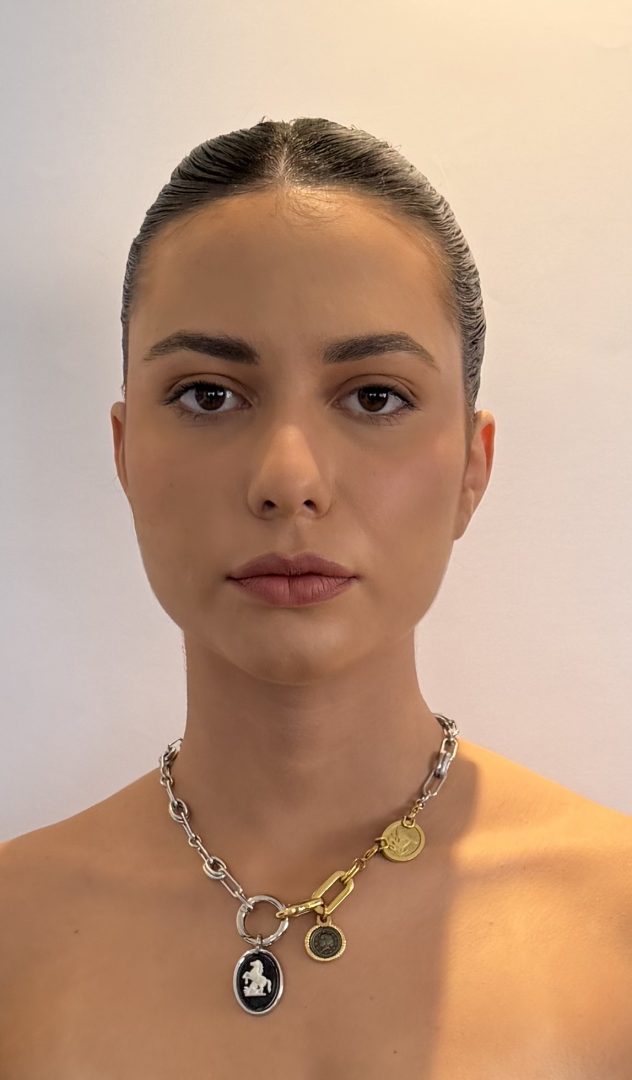 שרשרת נוכחות המציגה מפגש חצוף בין כסף לזהב, חוליות גסות ותליוני וינטג׳ עם אופי, זיכרונות ישנים שמקבלים חיים חדשים על היד. עוצמתי, מחוספס ואלגנטי.