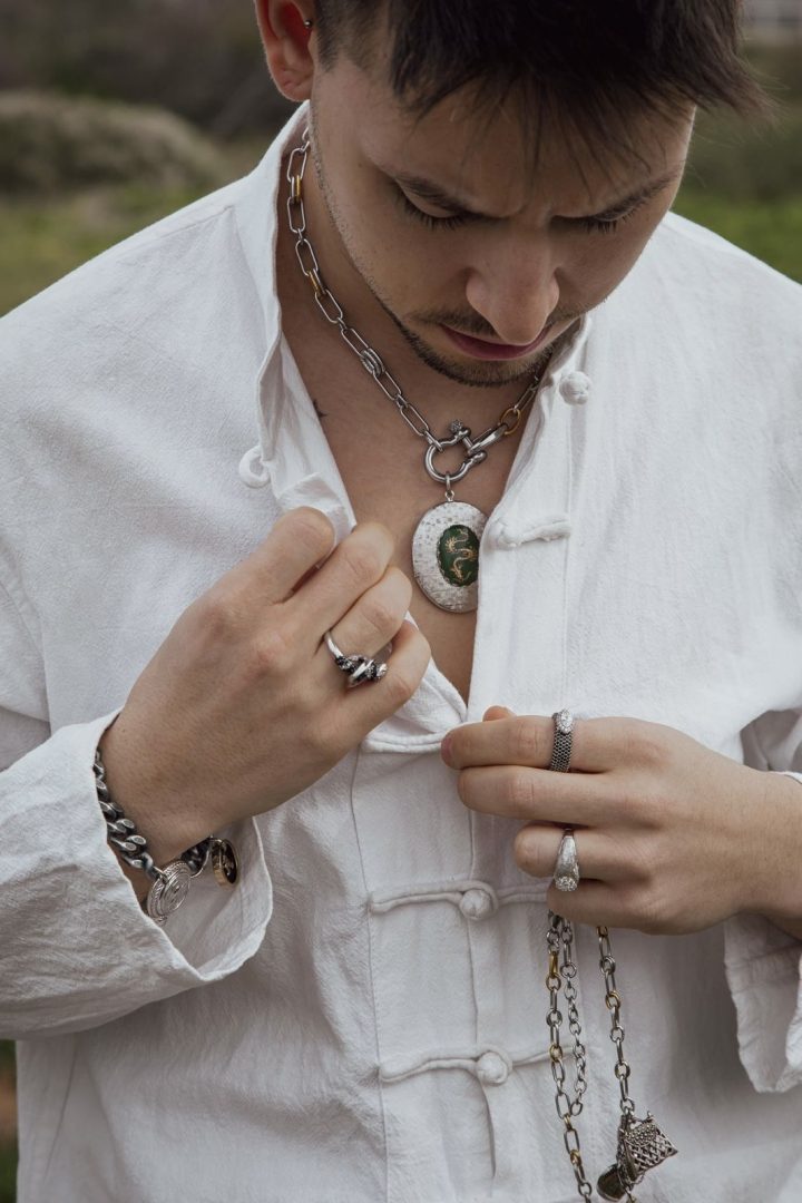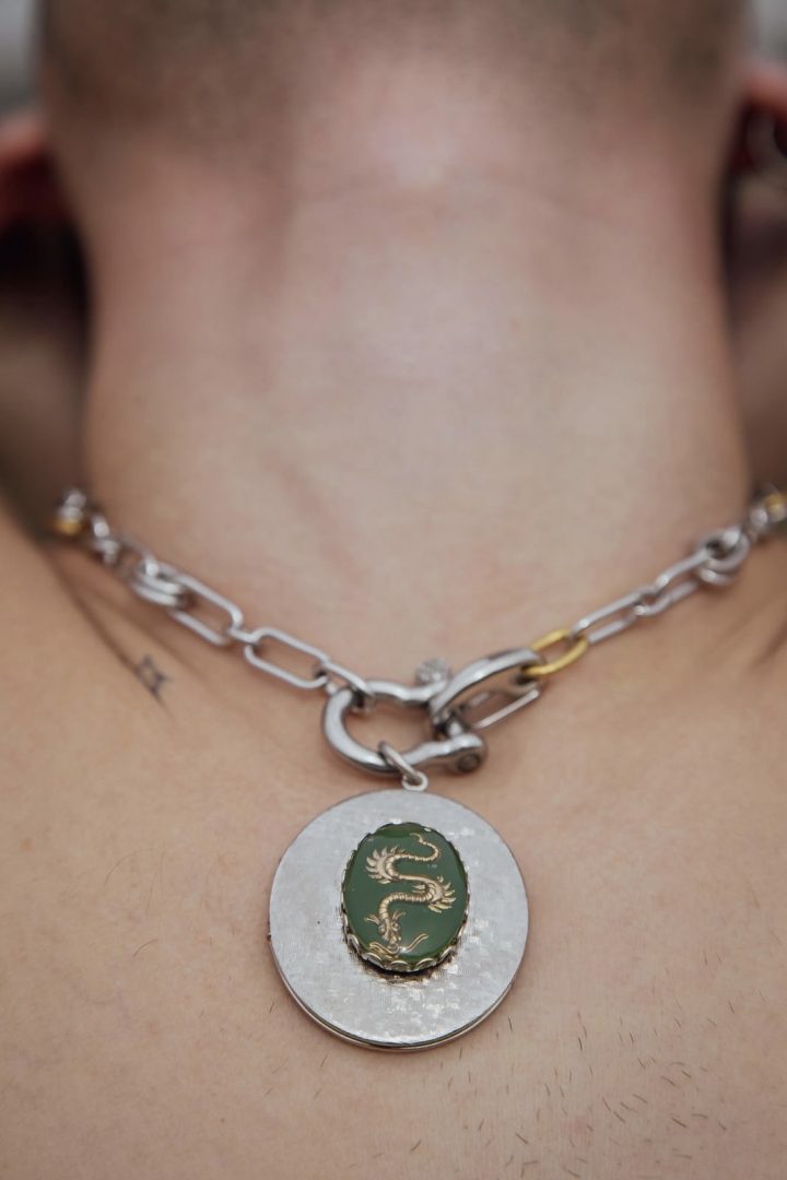 שרשרת סטייטמנט אלגנטית המשלבת חוליות כסופות עם נגיעות זהב עדינות ליצירת ניגוד אצילי ומדויק. במרכזה תליון אובלי נפתח עם קמאו דרקון ירוק בזהב, סמל לעוצמה, אצילות ונוכחות שקטה אך מוחלטת. קלאסית, חזקה, ועל־זמנית.